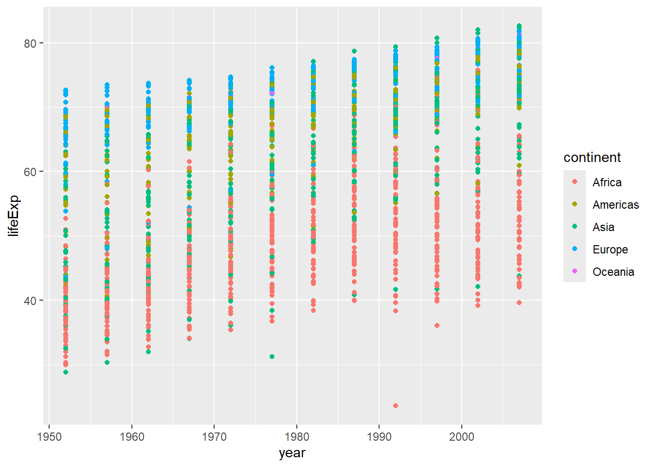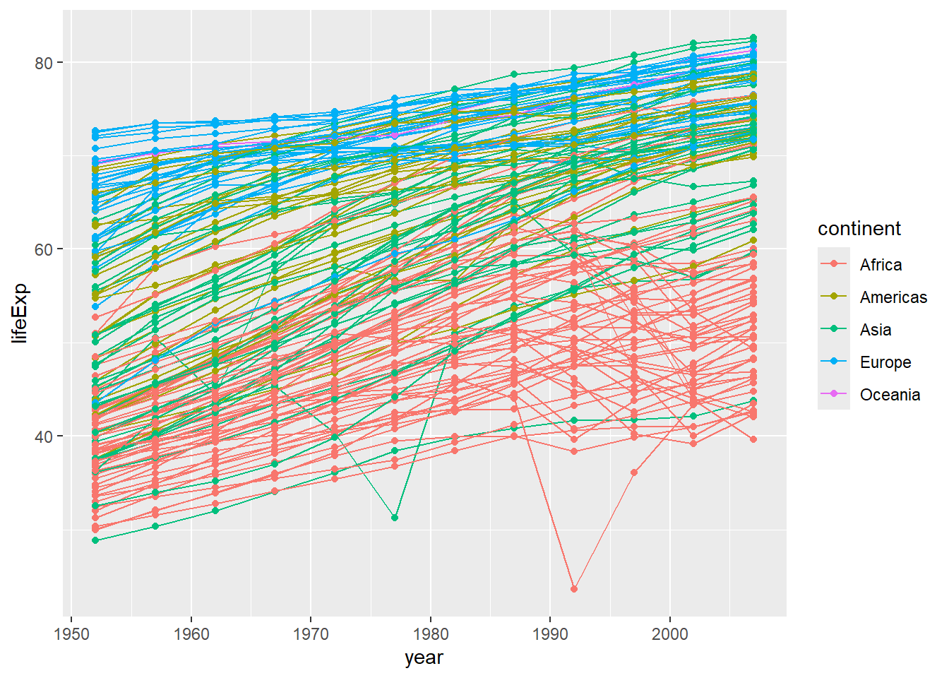 The solution presented below adds color=continent to the call of the aes function. The general trend seems to indicate an increased life expectancy over the years. On continents with stronger economies we find a longer life expectancy.