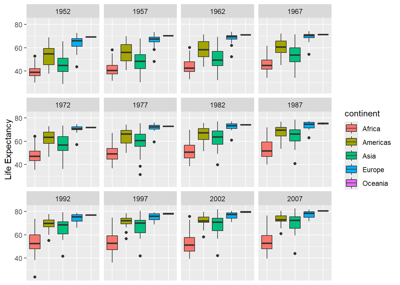 Earlier we visualized the change in life expectancy over time across all countries in one plot. Alternatively, we can split this out over multiple panels by adding a layer of facet panels.