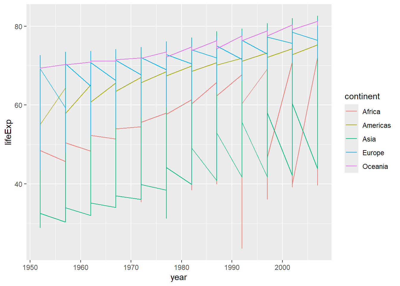 However, the result doesn’t look quite as we might have expected: it seems to be jumping around a lot in each continent. Let’s try to separate the data by country, plotting one line for each country: