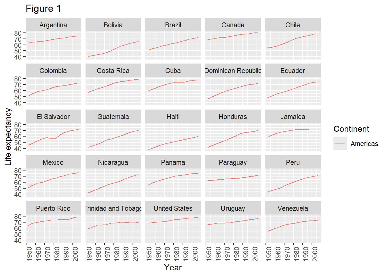 We start by making a subset of data including only countries located in the Americas. This includes 25 countries, which will begin to clutter the figure. Note that we apply a “theme” definition to rotate the x-axis labels to maintain readability. Nearly everything in ggplot2 is customizable.