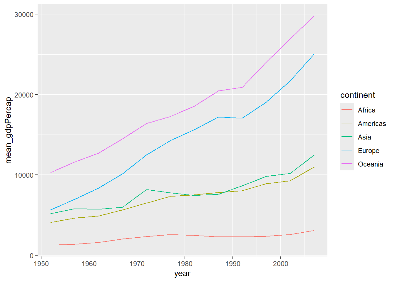 gdp_future_bycontinents_byyear_high_lifeExp %>%ggplot(mapping =aes(x = year, y = mean_gdpPercap, group = continent, colour = continent)) +geom_line()