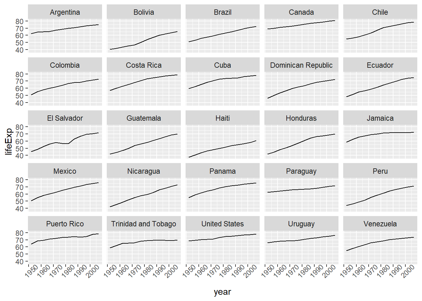 # Filter countries located in the Americasamericas <- gapminder[gapminder$continent =="Americas", ]# Make the plotggplot(data = americas, mapping =aes(x = year, y = lifeExp)) +geom_line() +facet_wrap( ~ country) +theme(axis.text.x =element_text(angle =45))