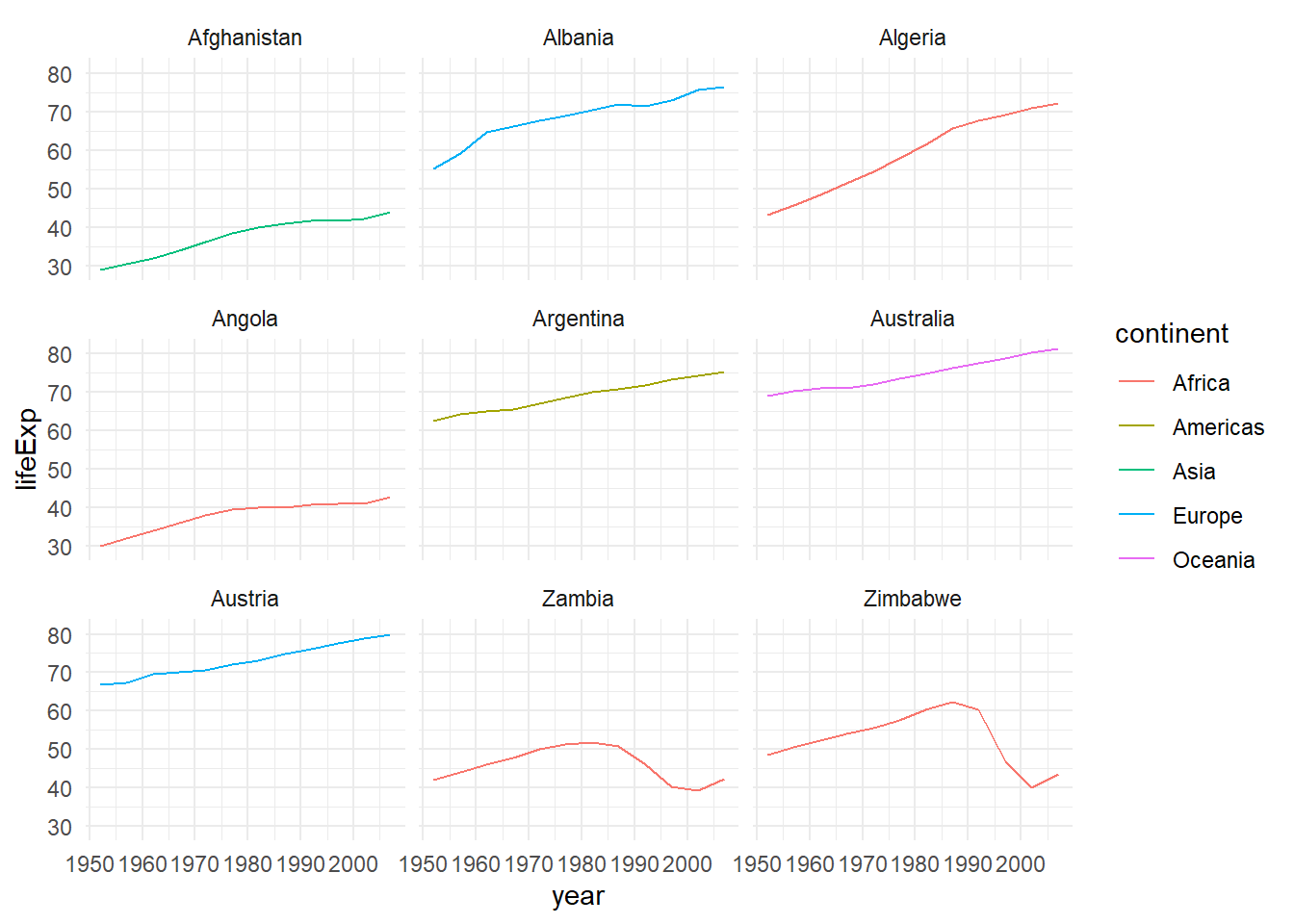 gapminder %>%# extract first letter of country name into new columnmutate(startsWith =substr(country, 1, 1)) %>%# only keep countries starting with A or Zfilter(startsWith %in%c("A", "Z")) %>%# plot lifeExp into facetsggplot(aes(x = year, y = lifeExp, colour = continent)) +# x and y and set colorgeom_line() +# line plotfacet_wrap(vars(country)) +# faceting variables theme_minimal() # set theme