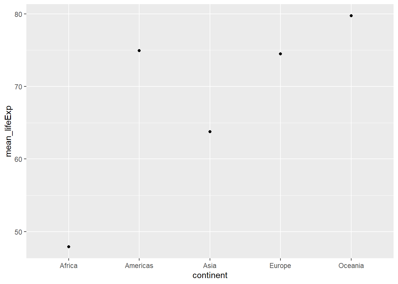 lifeExp_2countries_bycontinents %>%# dataggplot(aes(continent,mean_lifeExp)) +# x and y axisgeom_point() # scattered plot